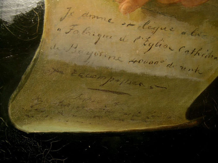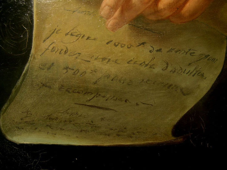 Le papier qu'il tient dan sa main a été repeint pour modifier le message qui y est inscrit. Les conservateurs ont choisis de retrouver l'inscription d'origine.