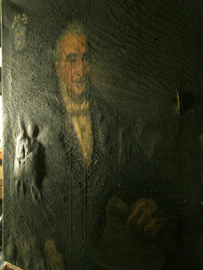 Portrait du XIXème déformé par une pièce collée à son revers par une épaisse couche de céruse.
